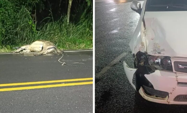 Com o impacto, o cavalo morreu no local. O motorista, apesar do choque e dos prejuízos materiais, agradeceu pelo livramento.