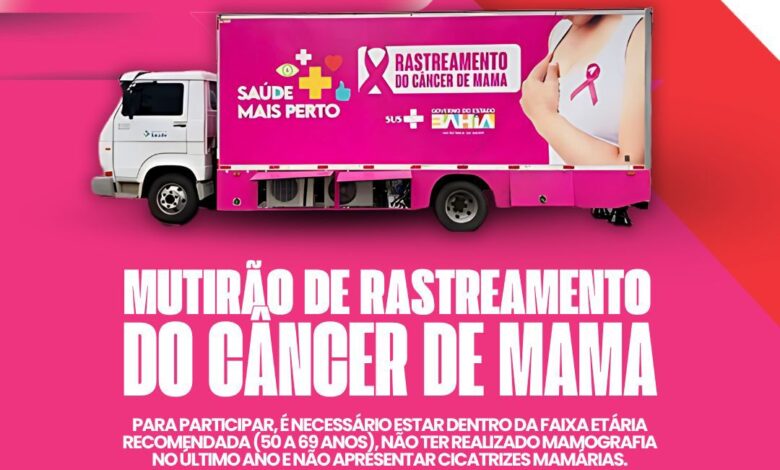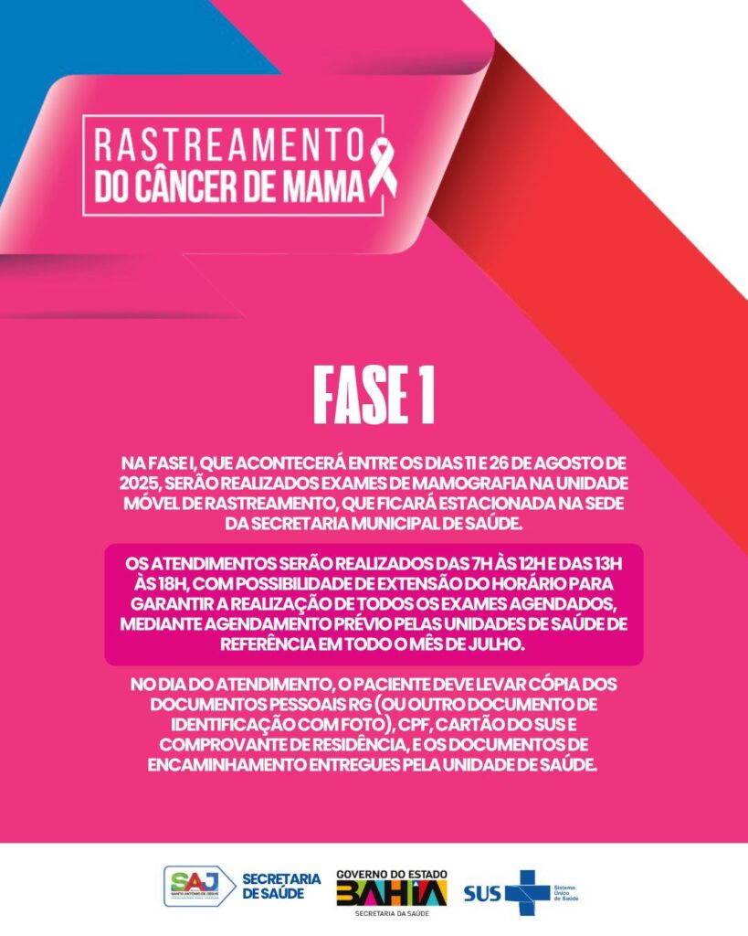 A Prefeitura Municipal de Santo Antônio de Jesus, em parceria com o Governo do Estado da Bahia, por meio da Secretaria da Saúde do Estado (Sesab) e da Secretaria Municipal de Saúde (SMS), realizará o Mutirão de Rastreamento do Câncer de Mama, com o objetivo de contribuir com a rede de atenção à saúde no diagnóstico precoce da doença. A iniciativa foca em mulheres com idade entre 50 e 69 anos, visando ampliar o acesso à mamografia bilateral de rastreamento.