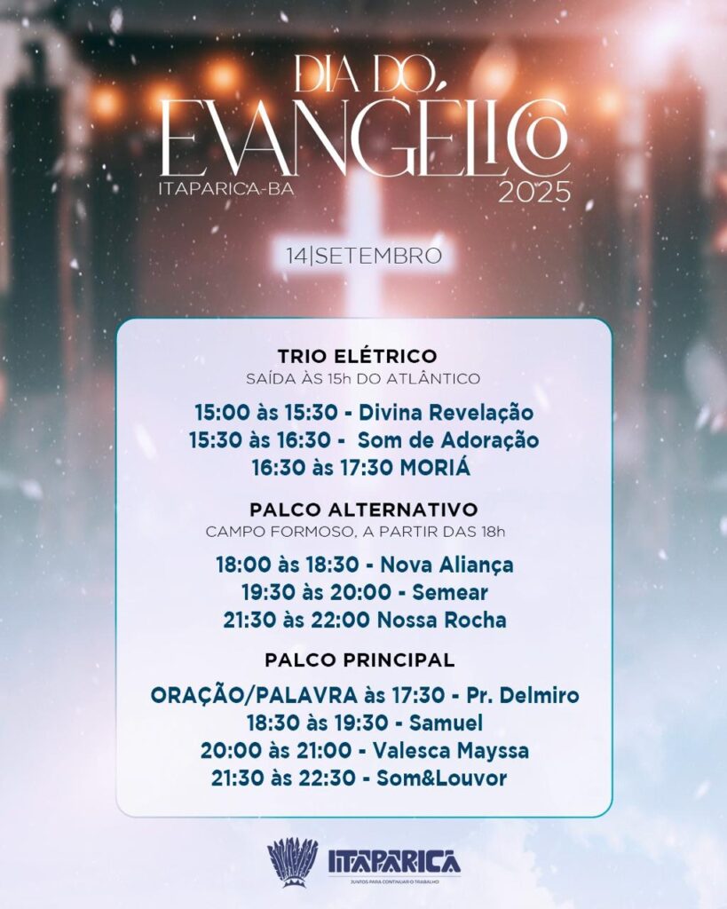 O Dia do Evangélico 2025 será marcado por momentos de louvor, palavra e união com grandes atrações como Som & Louvor e Valesca Mayssa, além de apresentações locais que vão abrilhantar ainda mais a festa.